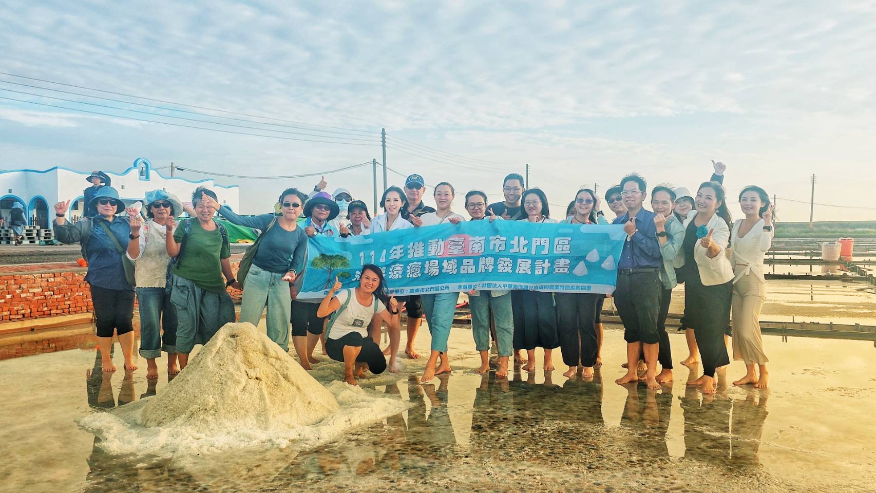 114年推動臺南市北門區海洋療癒場域品牌發展計畫第二場海洋療癒體驗活動活動圓滿成功,大家開心在井仔腳鹽田內合影