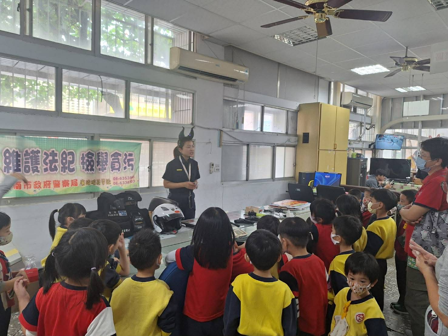 12月25日是中華民國行憲紀念日,也是民眾最熟悉的聖誕節慶日,新營區私立立上幼兒園於12月24日平安夜至新營警察分局進行參訪活動,分局督察組巡官趙明玉及黃翊禎化身為魔女警察及兔兔警察,為幼兒介紹派出所廳舍設置,並以幼兒園學期主題故事「乞丐王子」的故事為主軸,從主角王子淪為乞丐過程的各種遭遇,可以如何向警察求助,及在故事尾聲原本的小乞丐將本不屬於自己的國王寶座還給愛德華王子的美德,講述廉潔的觀念,活動結束時幼兒還不忘向魔女警察說再見,可愛的模樣讓警察的心都融化了。
