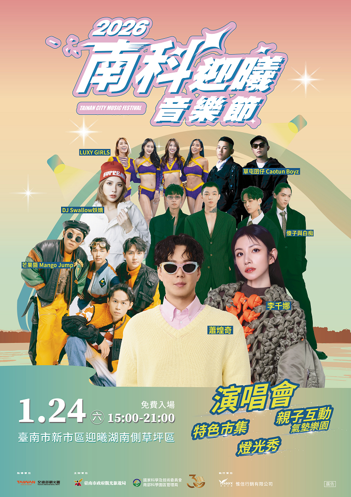 為持續擴大新市區周邊觀光動能、帶動地方產業發展與旅宿市場成長,臺南市政府觀光旅遊局與國家科學攜手技術委員會南部科學園區管理局,共同合辦「2026南科迎曦音樂節」。活動將於1月24日下午3點至晚上9點,在新市區南科迎曦湖南側移置有2024台灣燈會龍來台灣主燈的草坪區盛大登場。觀旅局今(9)日率先公布演唱會卡司陣容,邀請全國民眾相約迎曦湖畔,在迷人的湖畔夜色與豐富多元的音樂演出中,感受最熱血、最療癒、最具感染力的音樂饗宴。